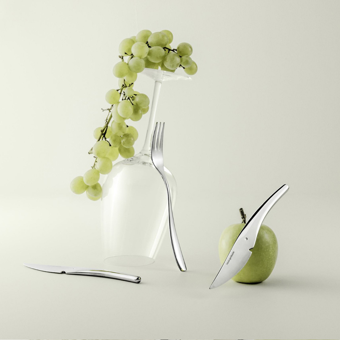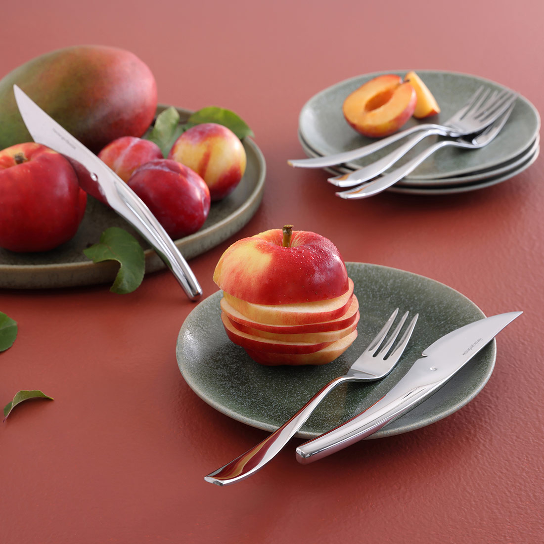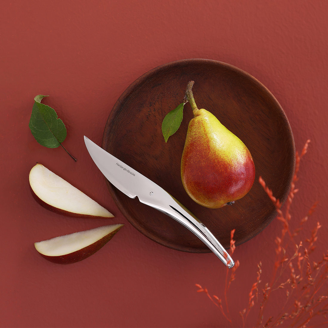 Fruktsettet designet av Per Finne er kniver til skrelling og deilig av frukt og grønnsaker. Knivbladet er i rustfritt stål for å tåle fruktsyre. Hakket i kniven gjør at du lettere kan dele frukt og grønnsaker presist. Bruk gaflene til å nyte de oppkuttede fruktbitene. Polert finish. Leveres i gaveeske.
